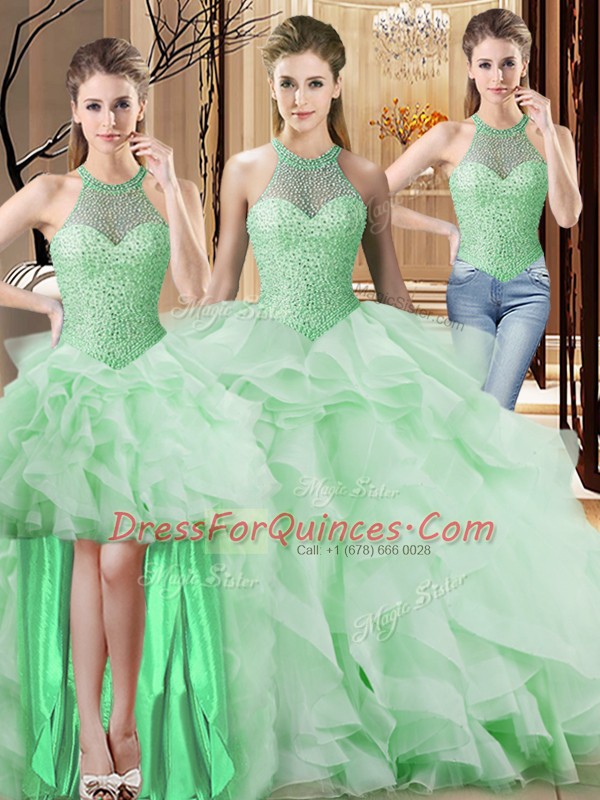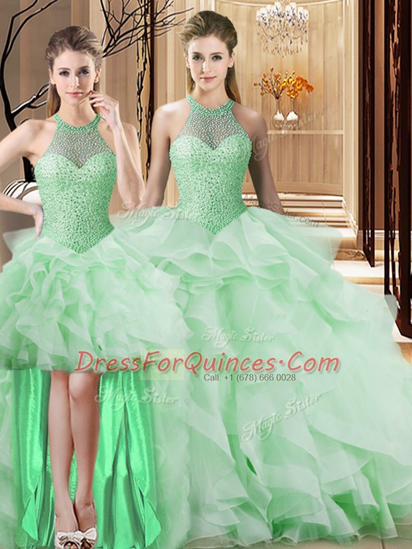Fashionable Apple Green Sweet 16 Dresses Organza Brush Train Sleeveless Beading and Ruffles