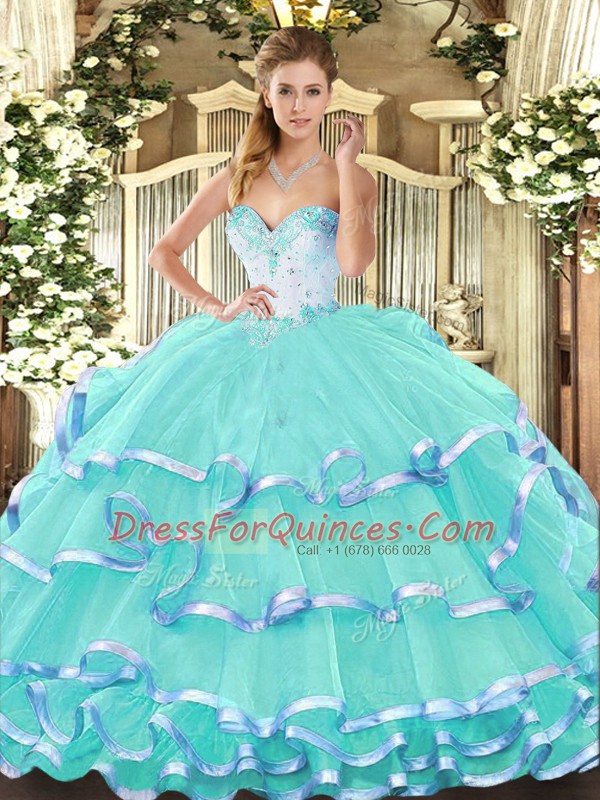 Fitting Turquoise Sleeveless Beading and Ruffled Layers Floor Length 15th Birthday Dress