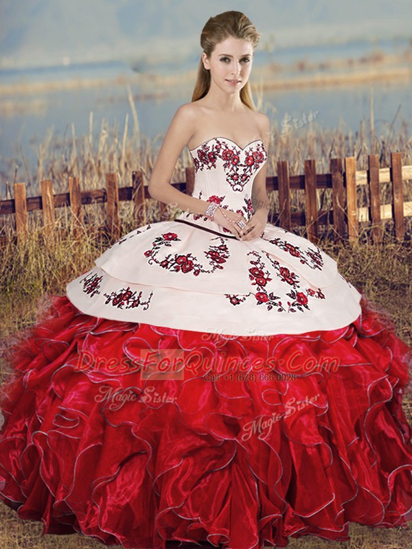Floor Length Lace Up Sweet 16 Dress White And Red for Military Ball and Sweet 16 and Quinceanera with Embroidery and Ruffles and Bowknot