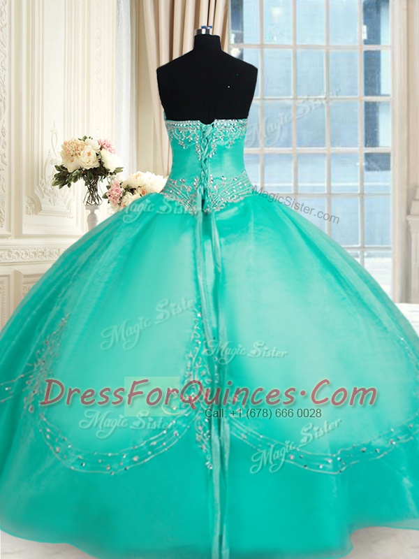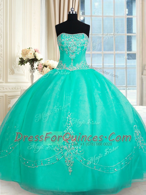 Floor Length Turquoise Sweet 16 Dress Organza Sleeveless Beading and Appliques