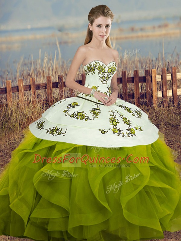 Glittering Olive Green Sweetheart Neckline Embroidery and Ruffles and Bowknot Quinceanera Gown Sleeveless Lace Up