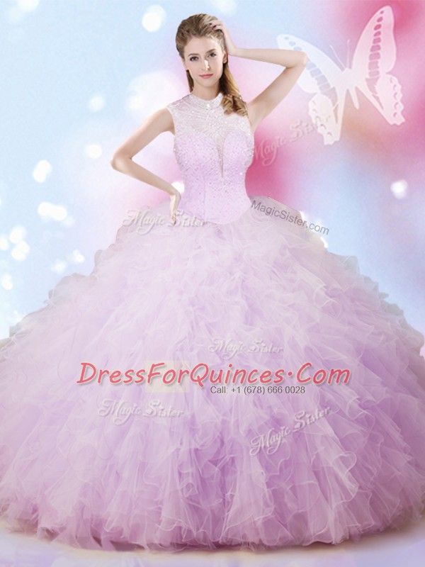 High-neck Sleeveless Lace Up Quinceanera Gown Lavender Tulle