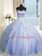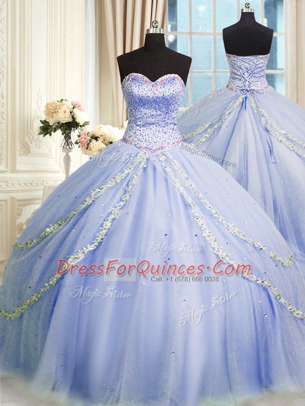Latest Lavender Tulle Zipper Sweetheart Sleeveless With Train Quinceanera Gown Brush Train Beading and Appliques