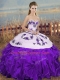 Low Price Floor Length Lace Up Quinceanera Gown White And Purple for Military Ball and Sweet 16 and Quinceanera with Embroidery and Ruffles and Bowknot
