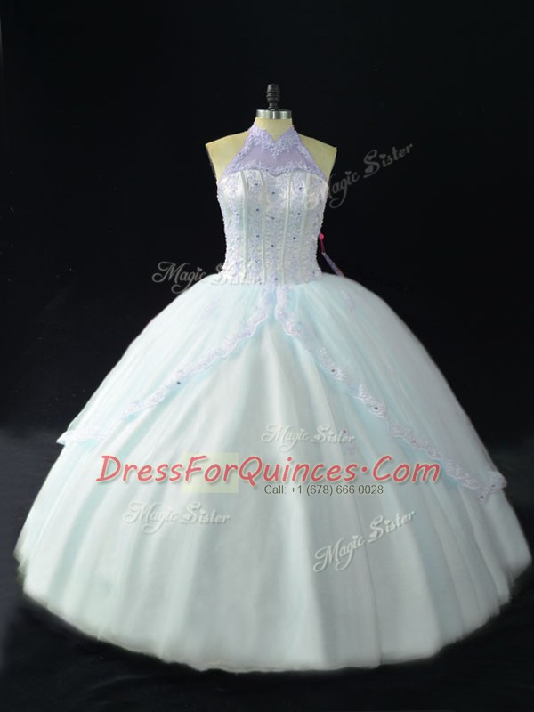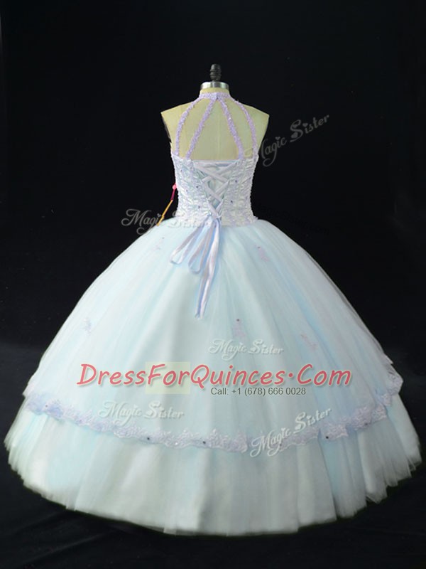 Luxurious Sleeveless Tulle Floor Length Lace Up Ball Gown Prom Dress in Blue with Beading