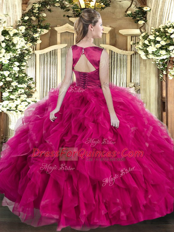 Luxury Sleeveless Floor Length Ruffles Lace Up 15th Birthday Dress with Fuchsia