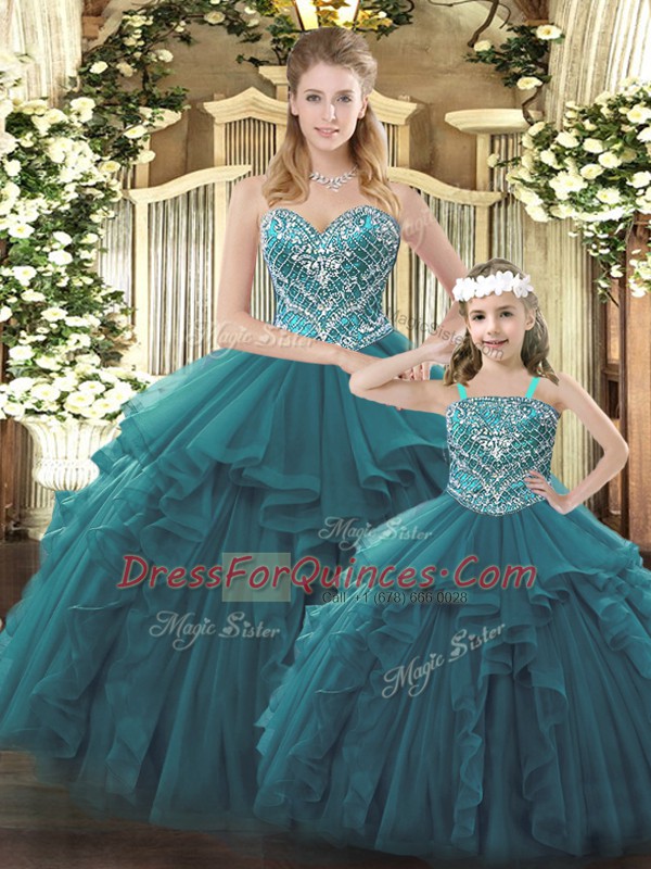 Nice Teal Ball Gowns Beading and Ruffles Quince Ball Gowns Lace Up Organza Sleeveless Floor Length