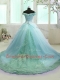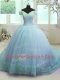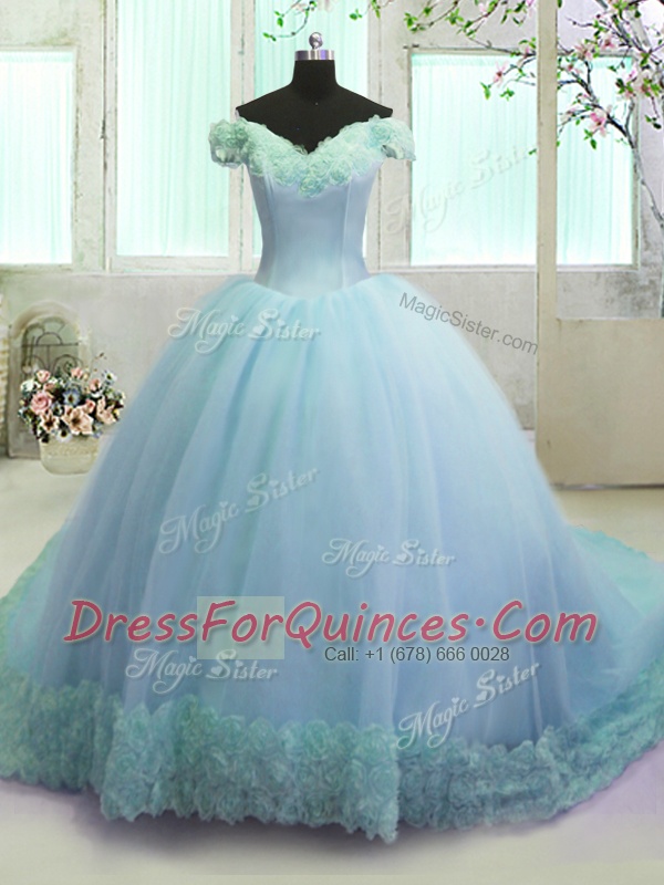 Off the Shoulder Light Blue Lace Up Sweet 16 Quinceanera Dress Hand Made Flower Sleeveless With Train Court Train