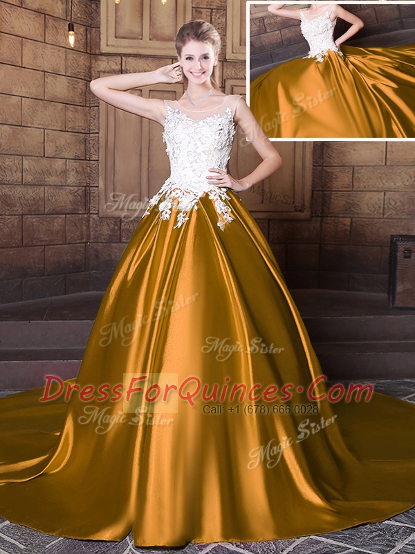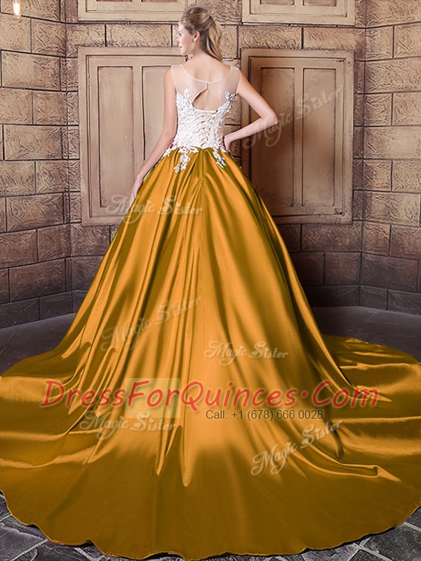 On Sale Elastic Woven Satin Scoop Sleeveless Court Train Lace Up Lace and Appliques Ball Gown Prom Dress in Gold
