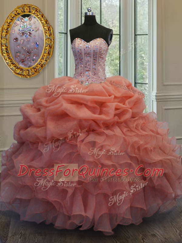 Pick Ups Floor Length Ball Gowns Sleeveless Orange Red Quinceanera Gowns Lace Up