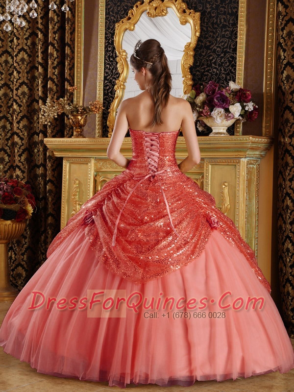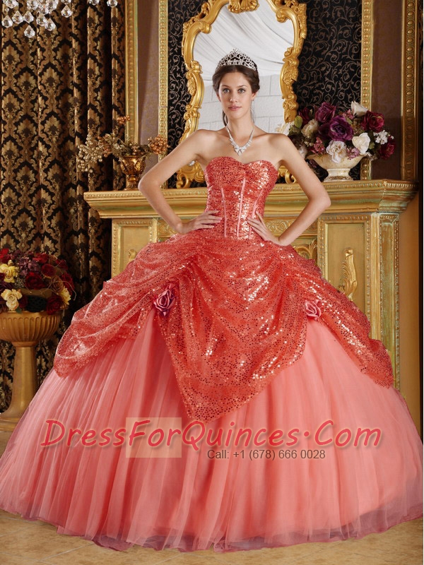Quinceanera Dress In Rust Red Ball Gown Sweetheart With Sequined and Tulle Handle Flowers In Classical Style