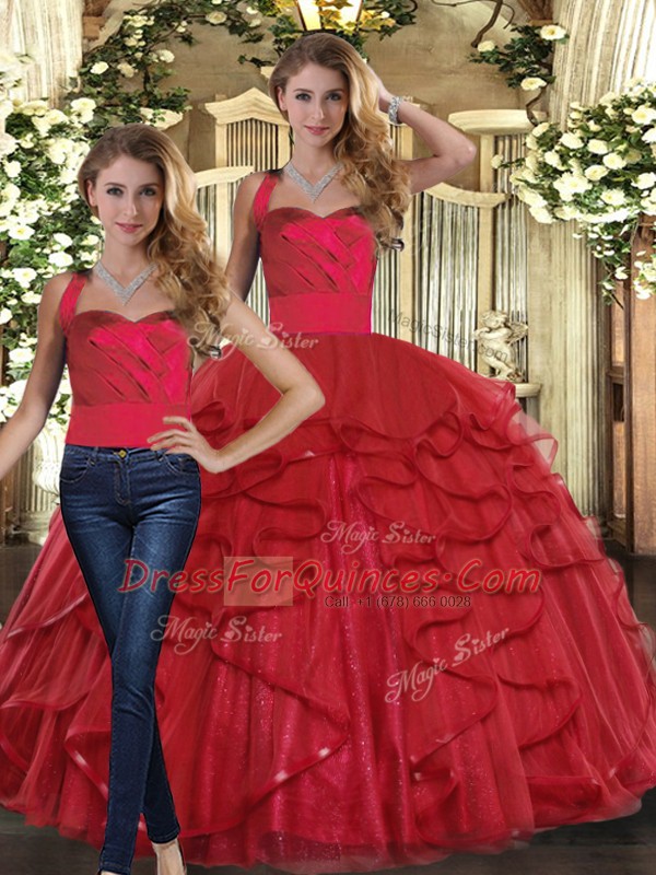 Red Straps Lace Up Ruffles Quinceanera Dresses Sleeveless