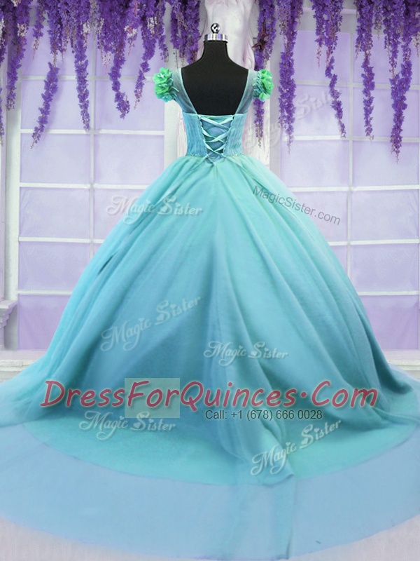 Scoop Hand Made Flower Quinceanera Gowns Blue Lace Up Short Sleeves Court Train