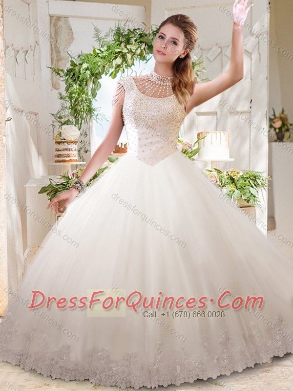 See Through Ball Gowns High Neck Lace Beaded Quinceanera Dress with Zipper Up