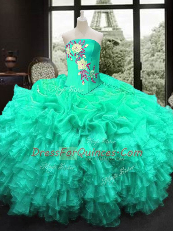 Sleeveless Lace Up Floor Length Embroidery and Ruffles 15th Birthday Dress