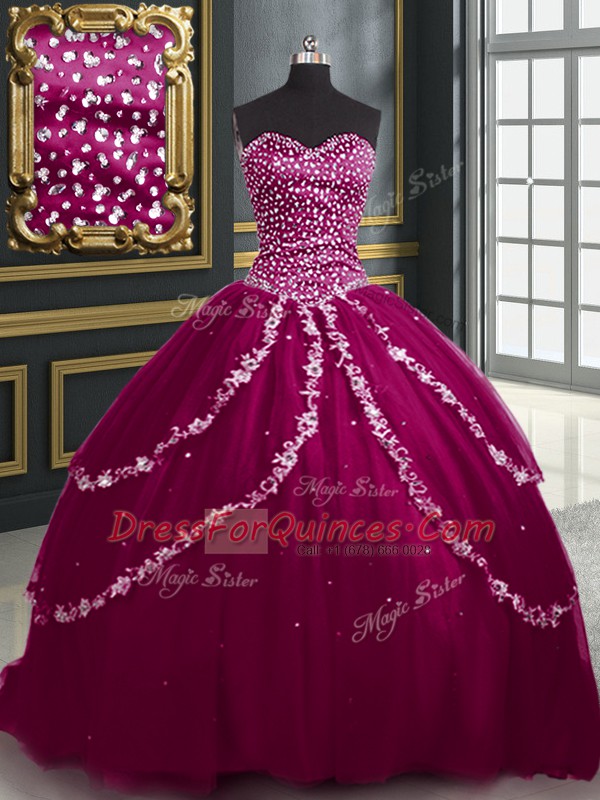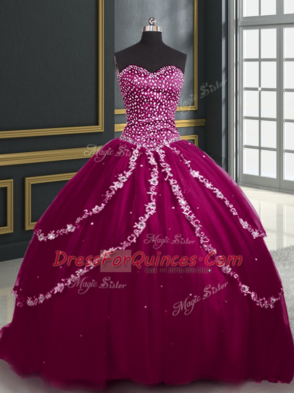 Unique Burgundy and Fuchsia Sleeveless Brush Train Beading and Appliques With Train 15 Quinceanera Dress