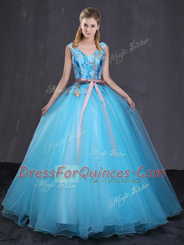 Appliques and Belt Sweet 16 Dress Blue Lace Up Sleeveless Floor Length