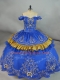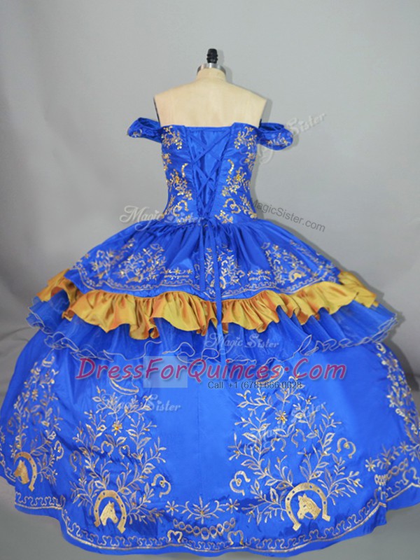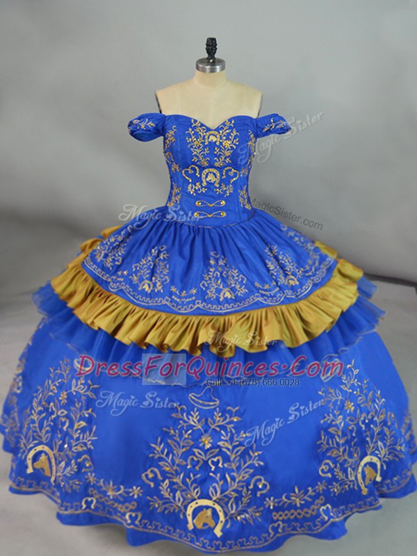Blue Ball Gowns Satin and Organza Off The Shoulder Sleeveless Embroidery Floor Length Lace Up 15th Birthday Dress