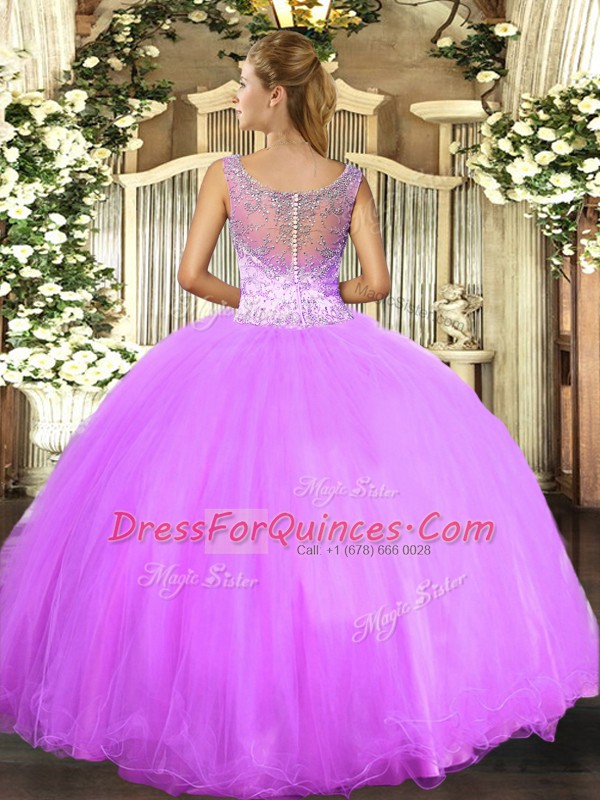 Blue Ball Gowns Tulle Scoop Sleeveless Beading Floor Length Clasp Handle Ball Gown Prom Dress