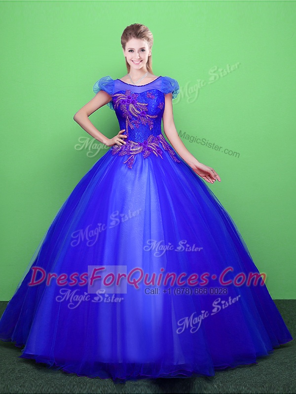 Blue Tulle Lace Up Scoop Short Sleeves Floor Length Sweet 16 Dresses Appliques