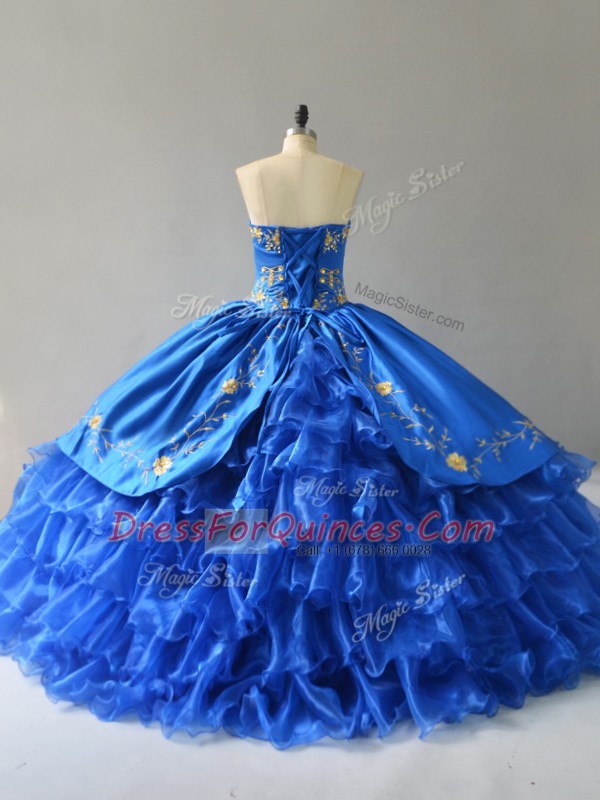 Custom Design Sweetheart Sleeveless Satin Ball Gown Prom Dress Embroidery and Ruffles Lace Up