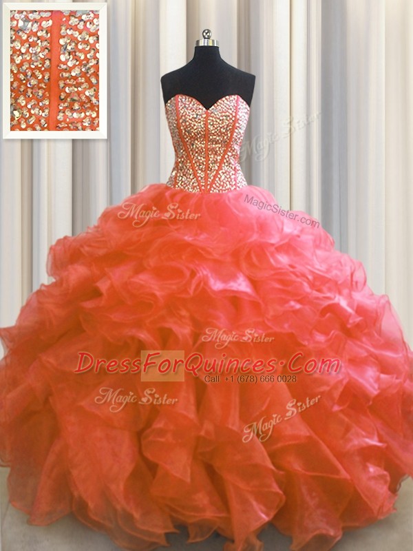Custom Design Visible Boning Red Ball Gowns Sweetheart Sleeveless Organza Floor Length Lace Up Beading and Ruffles Quinceanera Gowns