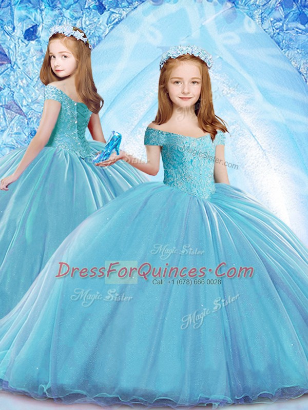 Dazzling Baby Blue Sleeveless Sweep Train Beading 15th Birthday Dress