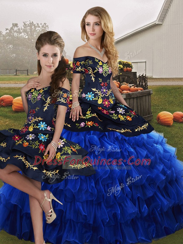 Deluxe Floor Length Blue And Black Sweet 16 Dress Organza Sleeveless Embroidery and Ruffled Layers