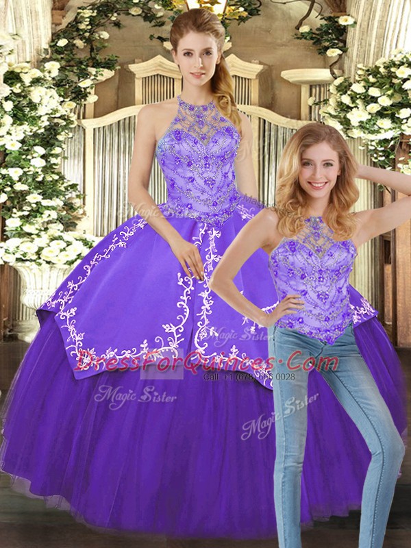 Elegant Purple Satin and Tulle Lace Up Sweet 16 Quinceanera Dress Sleeveless Floor Length Beading and Embroidery
