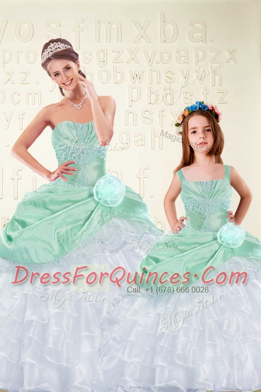 Excellent Floor Length Apple Green Quinceanera Dresses Organza and Taffeta Sleeveless Beading and Ruffles and Hand Made Flower