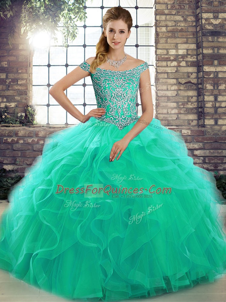 Excellent Turquoise Lace Up Sweet 16 Quinceanera Dress Beading and Ruffles Sleeveless Brush Train