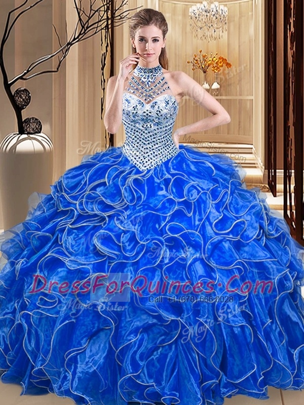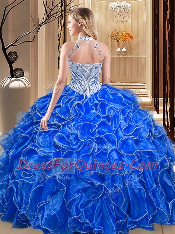 Glittering Halter Top Sleeveless Organza Floor Length Lace Up 15 Quinceanera Dress in Royal Blue with Beading and Ruffles