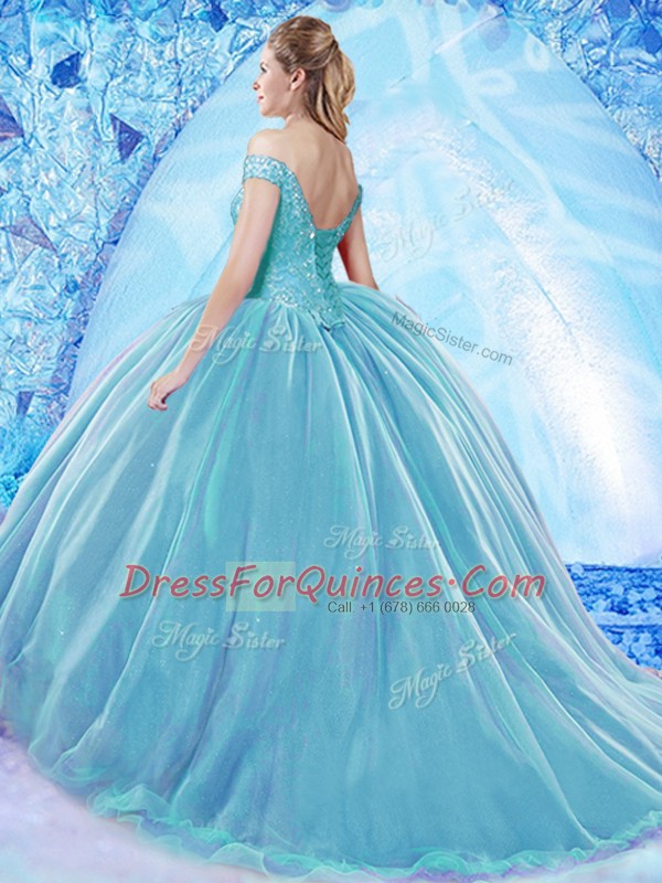 Lace Up Off The Shoulder Beading Sweet 16 Dresses Organza Sleeveless Brush Train