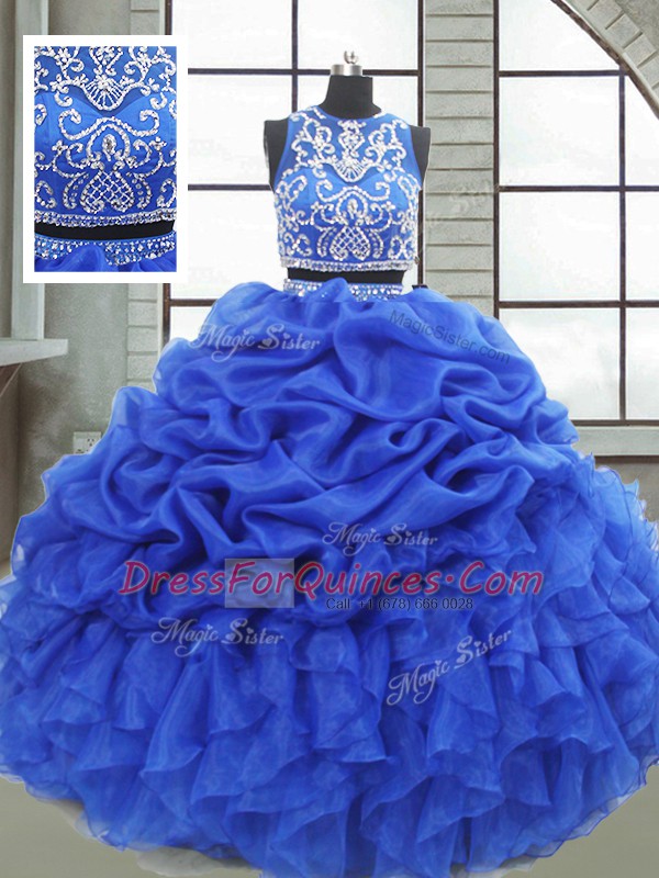 Lovely Scoop Sleeveless 15th Birthday Dress Floor Length Beading and Ruffles and Pick Ups Royal Blue Organza