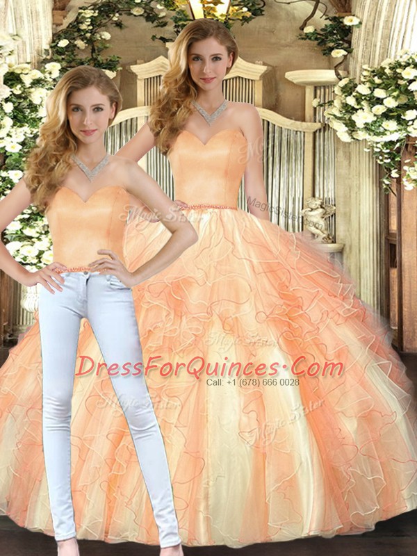Modern Two Pieces Quince Ball Gowns Orange Sweetheart Organza Sleeveless Floor Length Lace Up