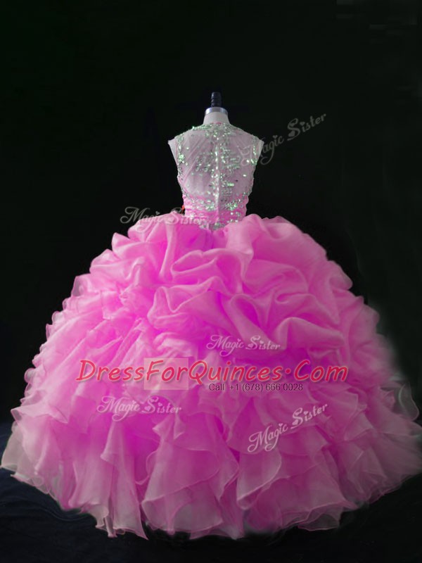Shining Hot Pink Zipper Straps Beading and Ruffles and Pick Ups Sweet 16 Dresses Organza Sleeveless