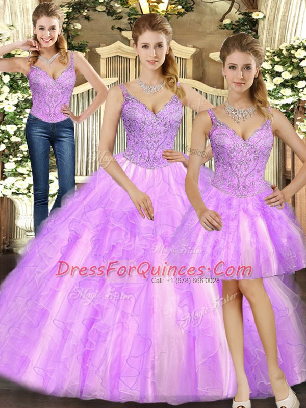 Sleeveless Organza Floor Length Lace Up 15th Birthday Dress in Lilac with Beading and Ruffles
