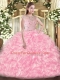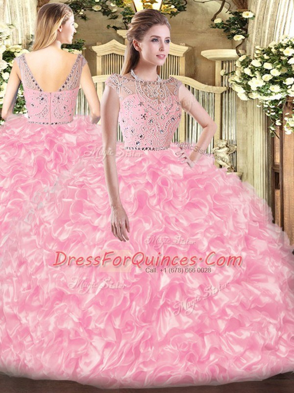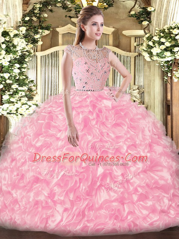 Super Sleeveless Floor Length Beading and Ruffles Zipper Ball Gown Prom Dress with Rose Pink