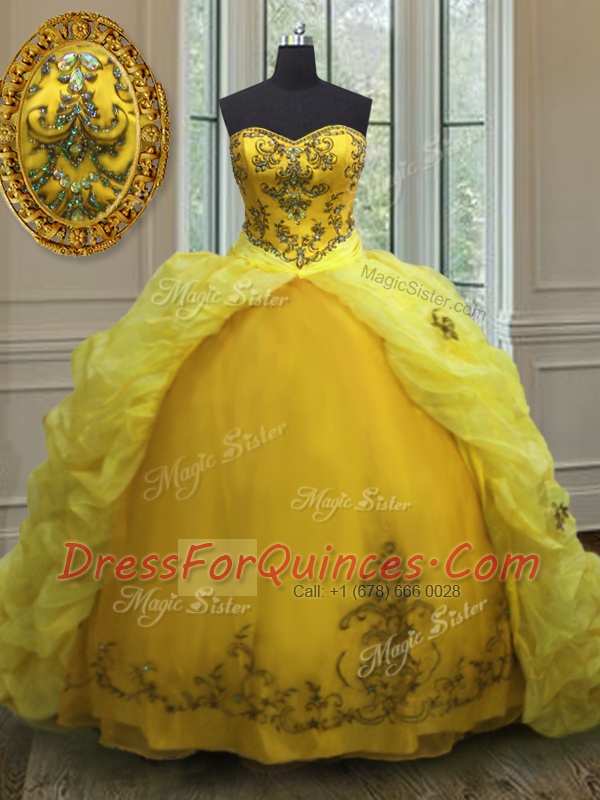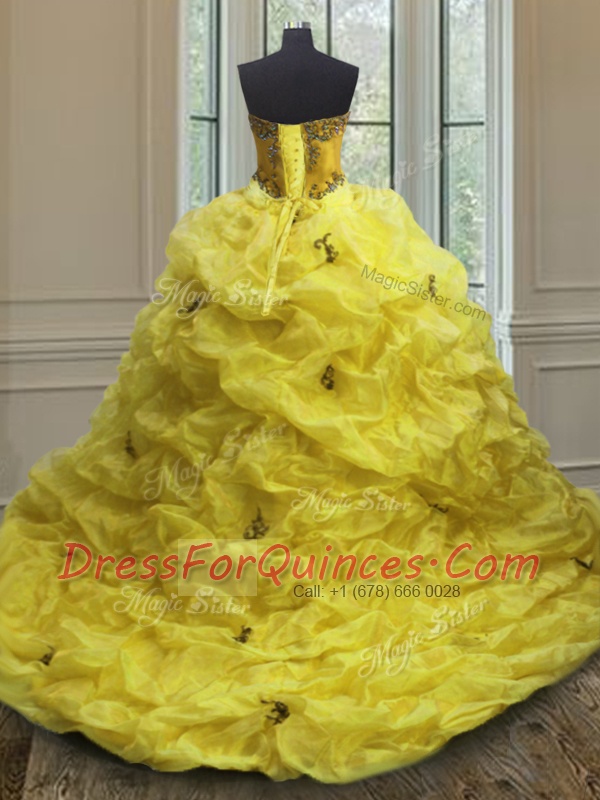 Sweet Sweetheart Sleeveless Sweet 16 Dresses With Train Court Train Beading and Appliques and Pick Ups Light Yellow Organza