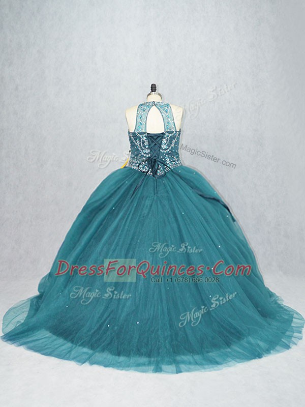 Teal Lace Up Scoop Beading Quinceanera Dress Tulle Sleeveless Brush Train