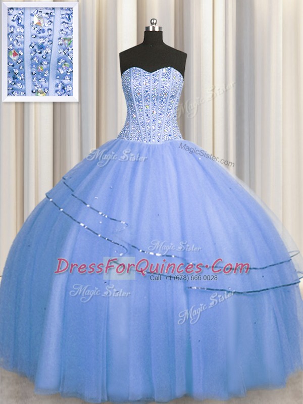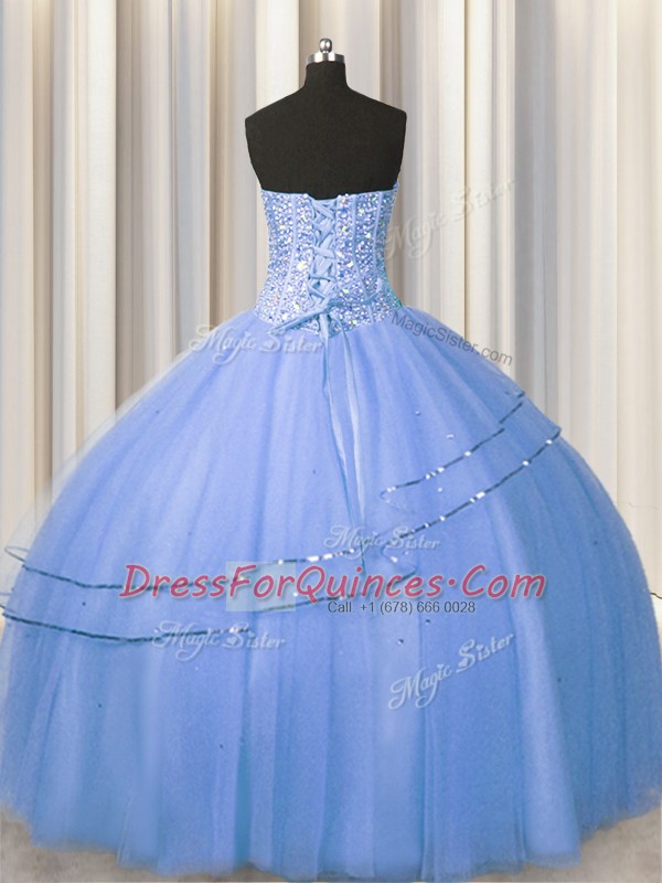 Visible Boning Big Puffy Blue Sleeveless Beading Floor Length Vestidos de Quinceanera