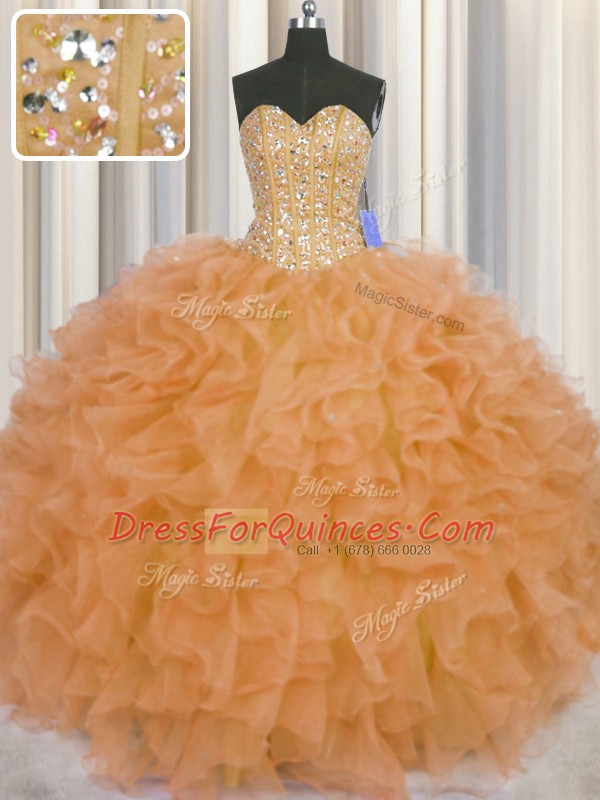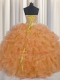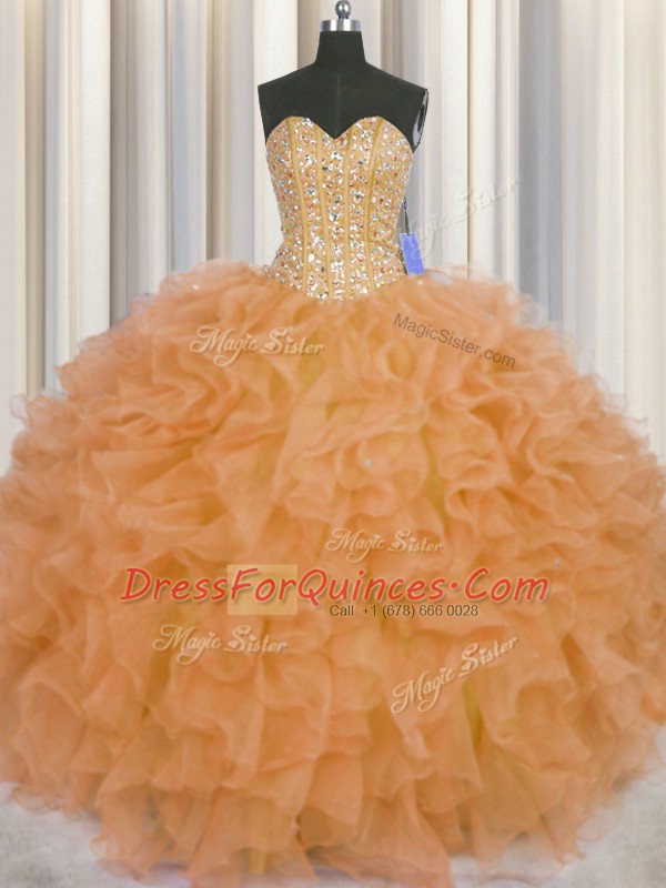 Visible Boning Orange Ball Gowns Organza Sweetheart Sleeveless Beading and Ruffles and Sashes ribbons Floor Length Lace Up Ball Gown Prom Dress