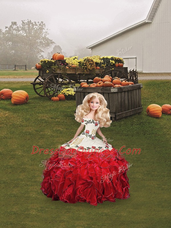 White And Red Ball Gown Prom Dress Military Ball and Sweet 16 and Quinceanera with Embroidery and Ruffles Off The Shoulder Sleeveless Lace Up