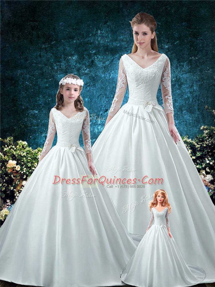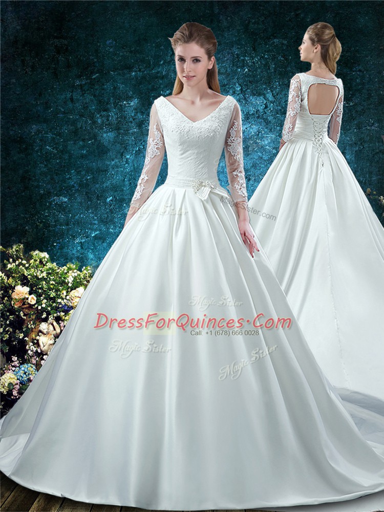 White Ball Gowns V-neck 3 4 Length Sleeve Satin Chapel Train Lace Up Lace and Belt Sweet 16 Dress