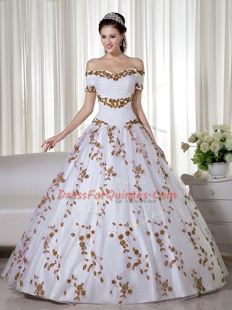 White Off The Shoulder Lace Up Embroidery Quinceanera Dress Short Sleeves