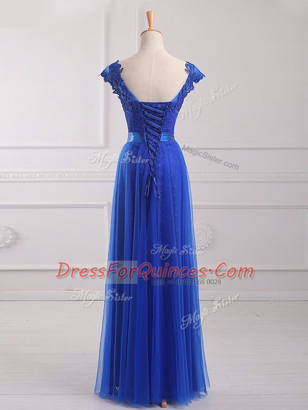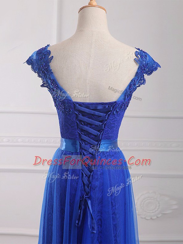 Attractive Royal Blue Lace Up V-neck Beading and Lace and Appliques and Belt Dress for Prom Tulle Short Sleeves