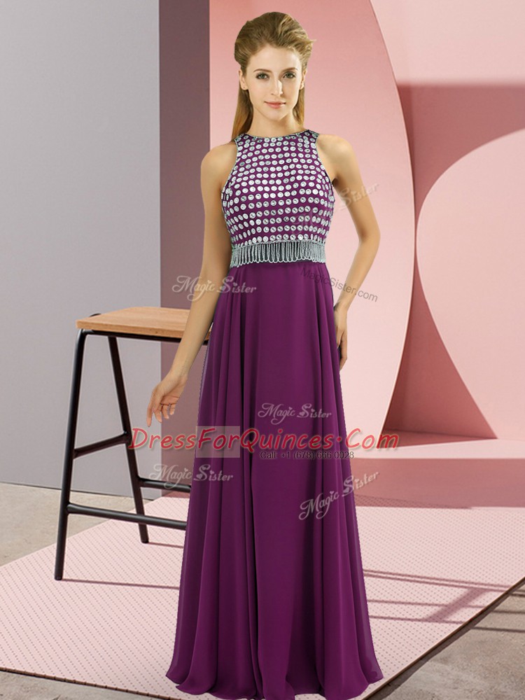 Chiffon Scoop Sleeveless Beading Prom Dresses in Eggplant Purple