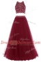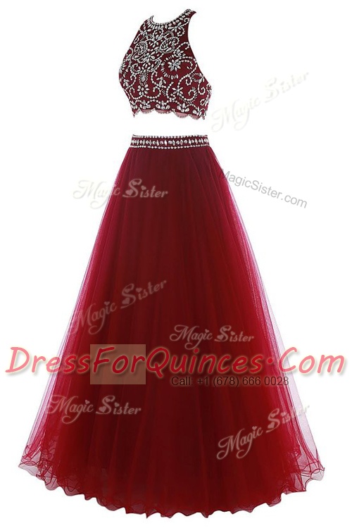 Customized Halter Top Burgundy A-line Beading Evening Dress Zipper Tulle Sleeveless Floor Length