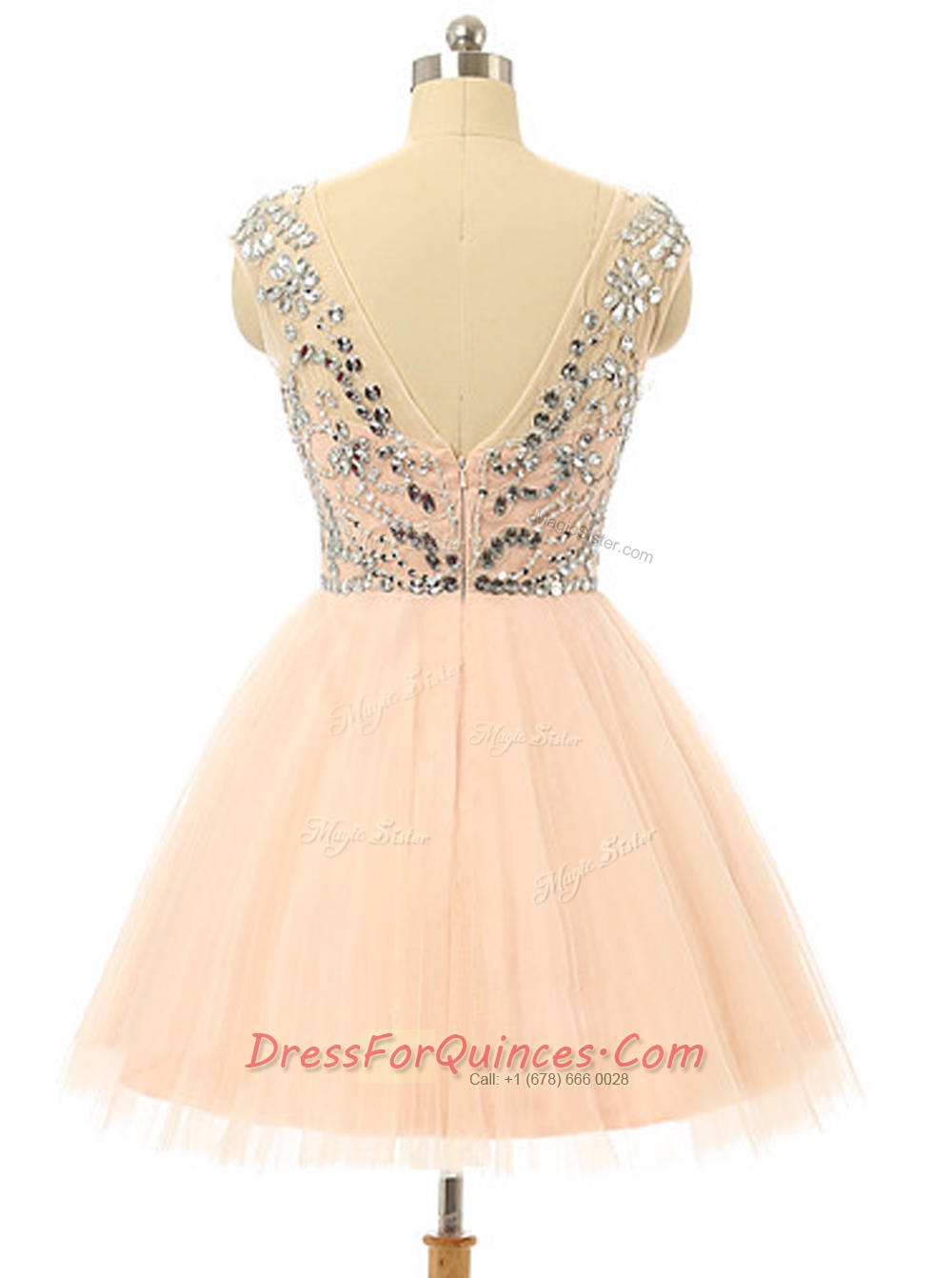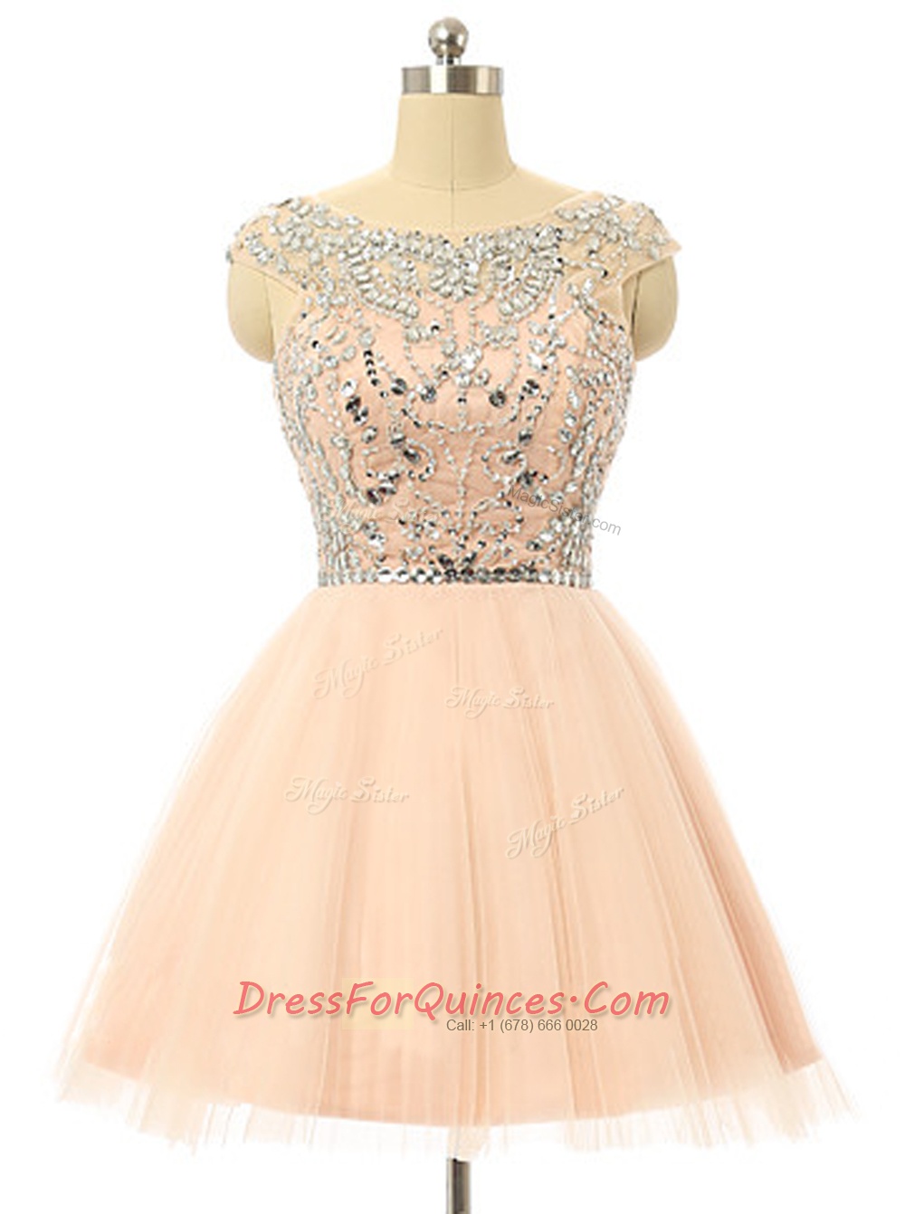 Customized Scoop Sleeveless Dress for Prom Knee Length Beading and Sequins Peach Tulle