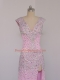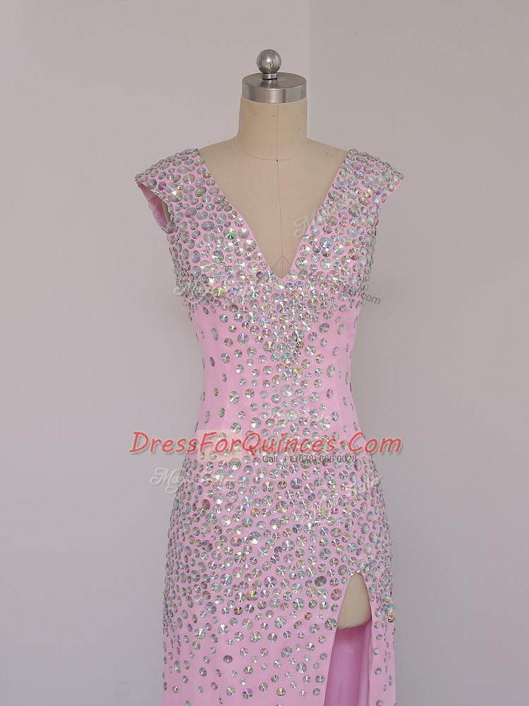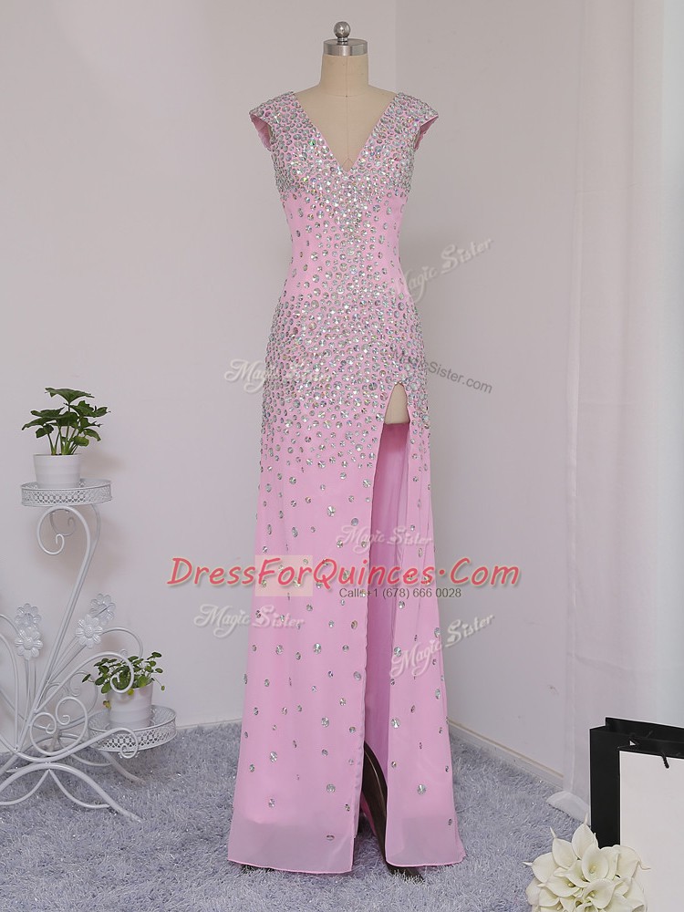 Fashionable Lilac Column/Sheath V-neck Short Sleeves Chiffon Floor Length Backless Beading Prom Dresses